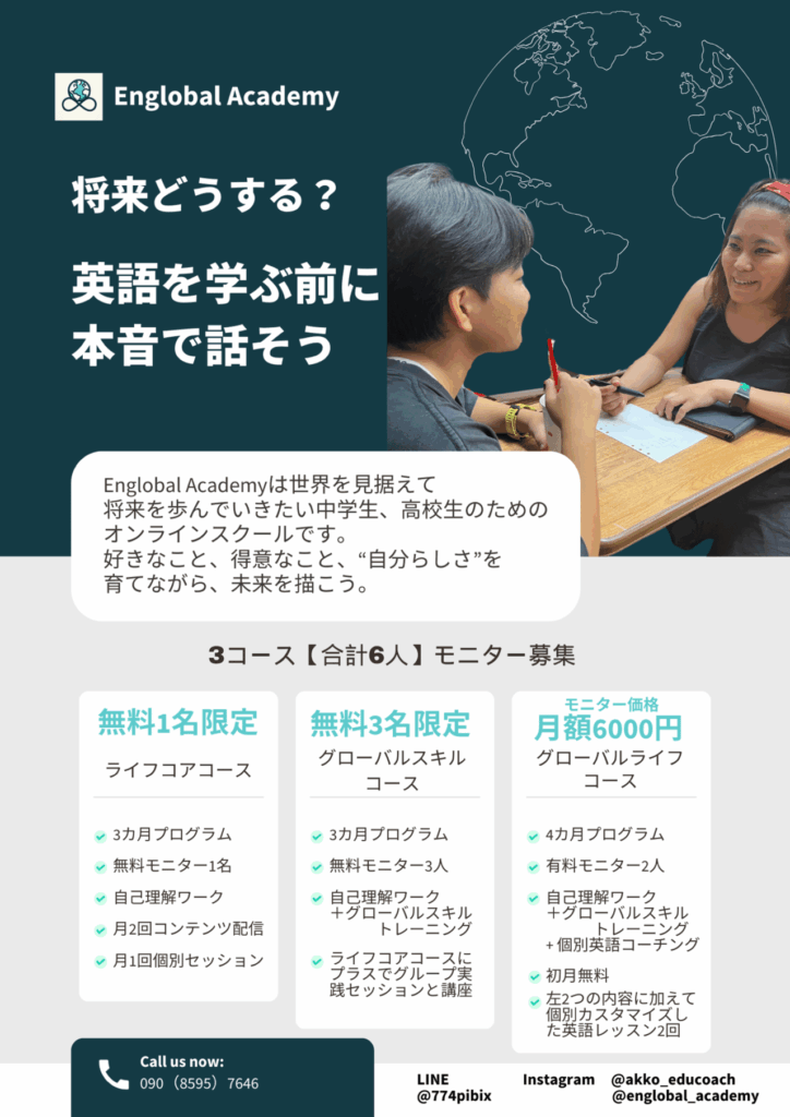 私が主宰するEnglobal Academyの体系的なサービスを正式にスタートする前に、数名限定でモニター体験をしていただける中高生(と、その保護者)を募集しています。